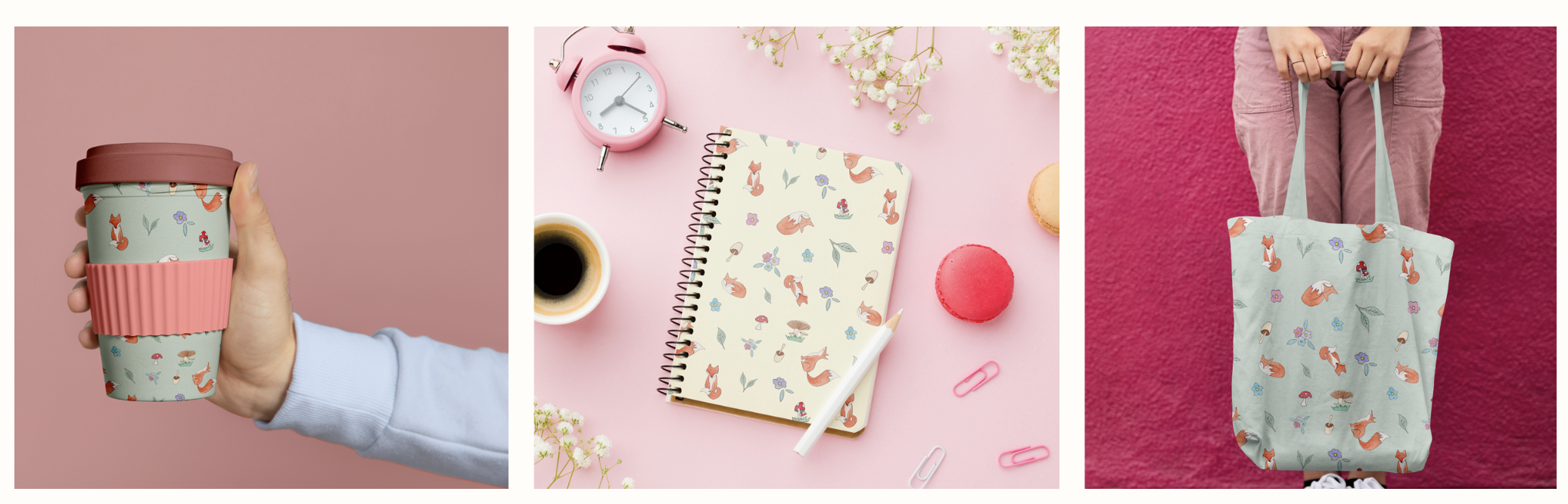 Imagine slipping into peach or cream pyjamas with Mushroom Meadow Mischief. Imagine a sage green tote with Foxes Path accents, telling the story of adaptability and wild beauty. Imagine a coordinated bedding set that feels just as beautiful in an adult bedroom as it does in a nursery.