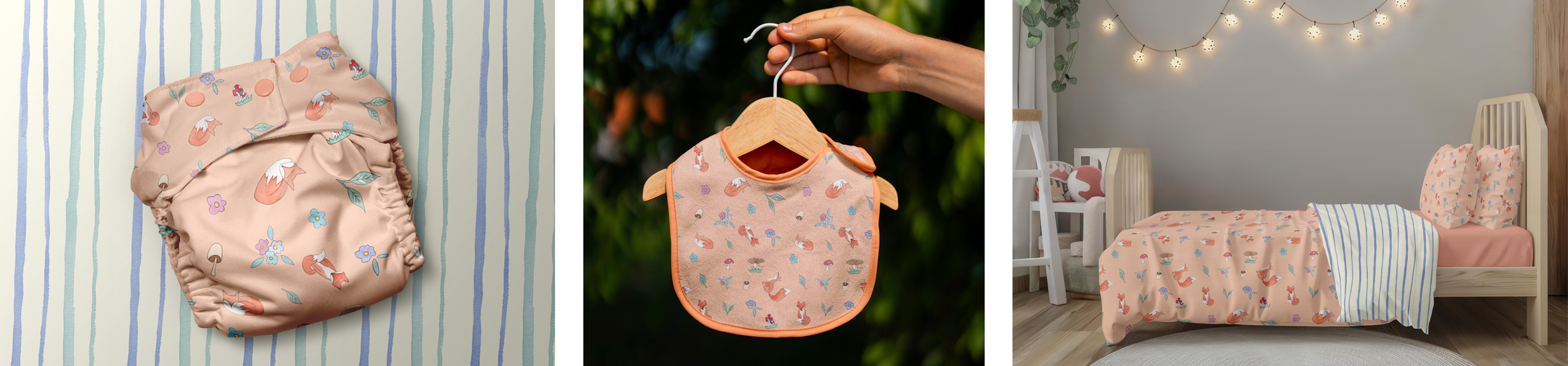Layered products - reversible nappies with Foxes Path on the back, bedding with striped trim, coordinating clothing and accessories that feel curated and intentional.