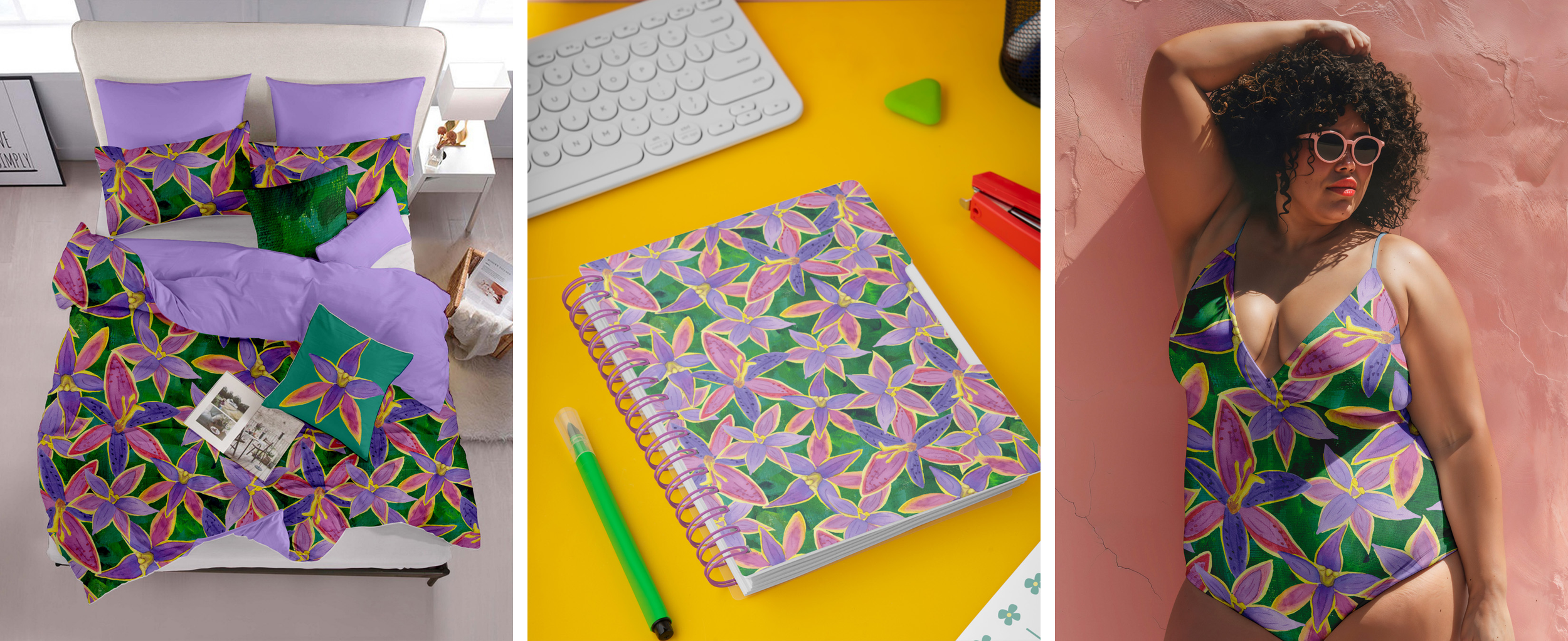 The colour palette mirrors the orchid's natural beauty: deep purples that speak to transformation, subtle blues representing trust and wisdom, warm yellows for joy and optimism. Each bloom is rendered with delicate detail, celebrating the intricate beauty that only patience can create. The pattern flows organically, with blooms nestled close together in an intimate dance - a reminder that while we each walk our own path, we bloom most beautifully when we finally plant ourselves.